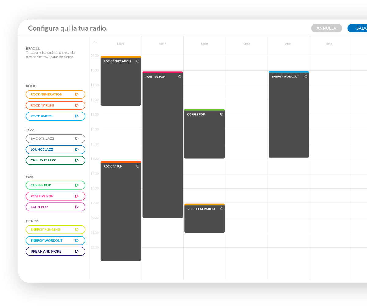 Decidi tu, per ogni ora del giorno, per ogni giorno della settimana cosa ascoltare, selezionando fra oltre 300 moods musicali, studiati apposta per te, anche senza diritti SIAE. Puoi aggiungere e gestire la messa in onda di spot personalizzati, rubriche e notiziari per arricchire il tuo palinsesto o ascoltare musica senza interruzioni.
